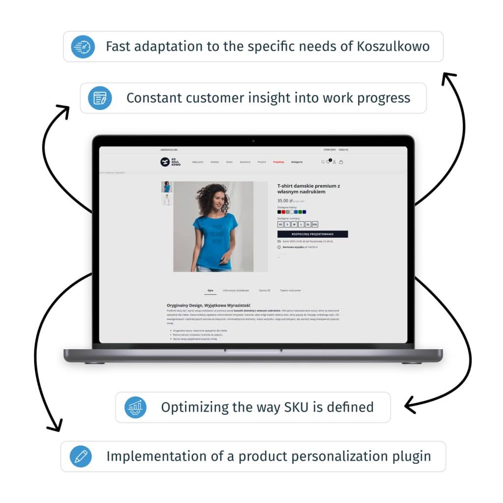 At the implementation stage, it was crucial to implement a dedicated plug-in for product personalization and to match it to the nature of Koszulkowo’s assortment. A major challenge was the structure of products and their variants, so our team optimized the way SKUs were defined to keep the database transparent and ensure smooth operation of the system even with a large number of combinations. The graphic design was based on a ready-made template, which allowed us to shorten the implementation time and match the aesthetics of the store to the existing branding, while staying within the budget.