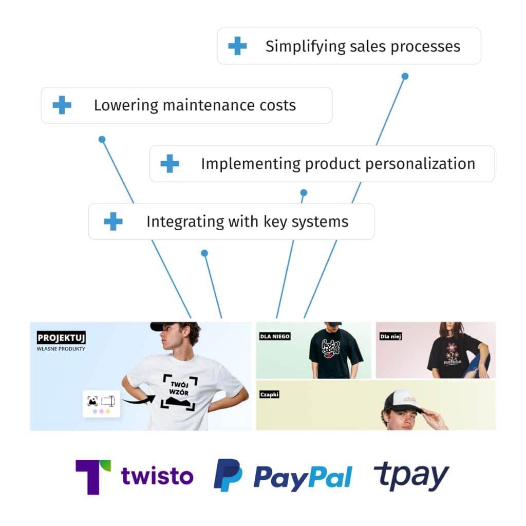 The main goal of the cooperation was to move the Koszulkowo store from the Magento platform to WooCommerce. The client was looking for a solution that was more flexible, easier to maintain, and, above all, cheaper to develop. The key requirement was the ability to personalize products – the store offers T-shirts, sweatshirts, and other printed accessories, so implementing an intuitive configurator that allows customers to create designs independently was essential.