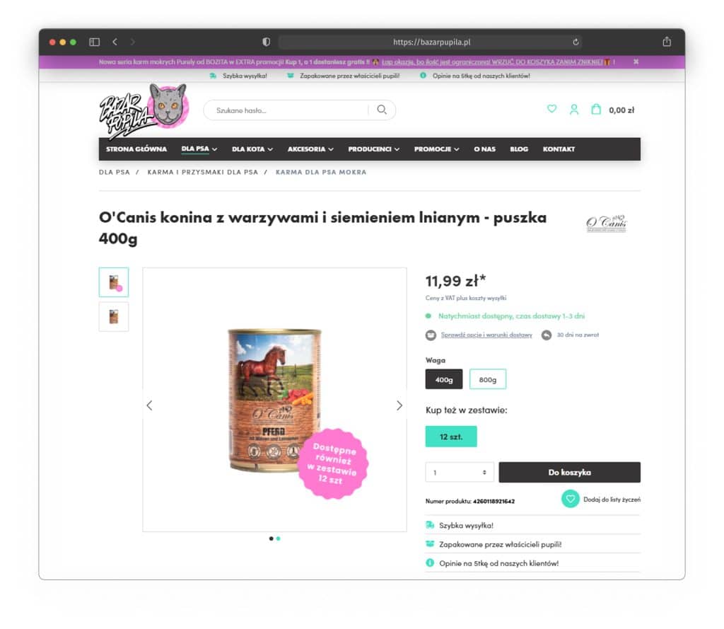 At our client BazarPupila.pl, the canned food sets, packaged 12 pieces each, have proven to be excellent; thanks to their use, the average basket containing canned food has increased by 32%. This did not require any changes to the warehouse, thanks to our proprietary solution for Shopware 6 for kits, the inventory integrates with the product contained in the kit, and in the order they appear as single products, thanks to which no modifications were required in the integration with Baselinker and ERP.
